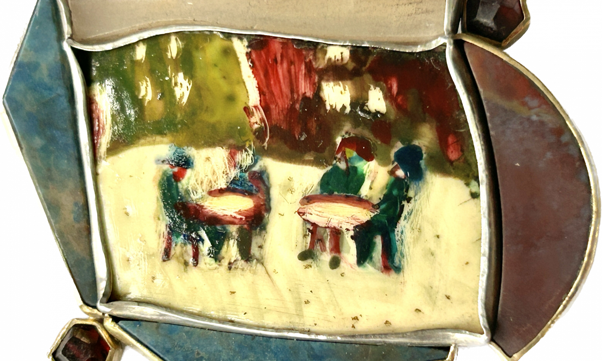750er Gold & 935 Silber, Achate, Jade, Granat, bemaltes Straußenei (Malerei: Angelika Stielow)